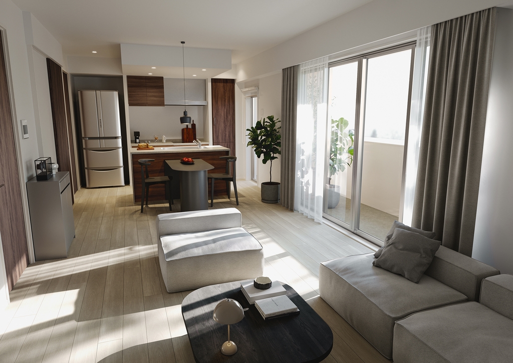 Đây là bản vẽ phối cảnh nội thất cho Encrest Hakata EXCEED, một dự án chung cư của En Holdings Co., Ltd. Bằng cách nhấn mạnh vào ấn tượng ánh sáng tự nhiên chiếu qua các ô cửa, chúng tôi đã tạo ra một khu vực phòng khách/phòng ăn/bếp rộng rãi, vừa yên tĩnh vừa sang trọng.
